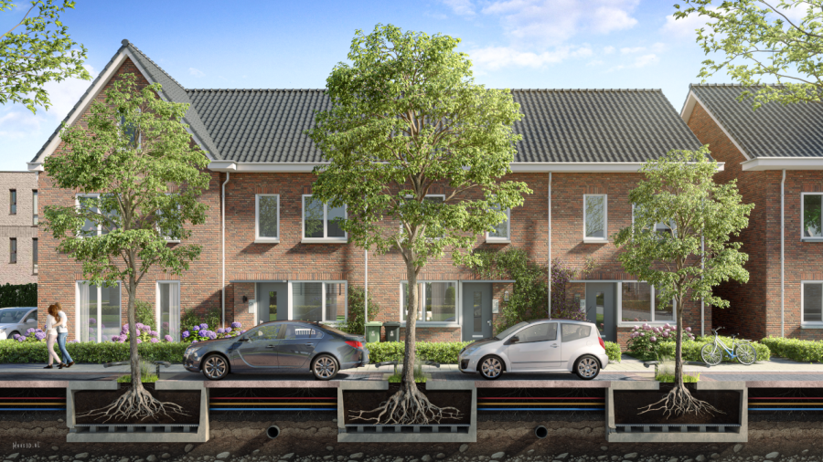 - Waterbeheer: Het geïntegreerde waterreservoir vangt piekbuien op en gebruikt dit water om de straat lokaal te koelen.