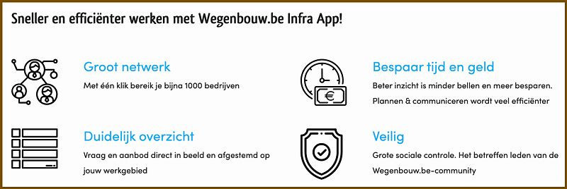 Wegenbouw.be Infra App is het hulpmiddel om de planning van machines, personeel en grondstoffen, etc. binnen de 'grond - groen - infra' sector te optimaliseren. Bedrijven krijgen met de communicatie software direct een overzicht van wat beschikbaar is en gevraagd wordt in de regio. Werken met Wegenbouw.be Infra App betekent voor de gebruikers tijdsbesparing, vergroten van het aantal contacten, kostenbesparingen en omzetvergroting.