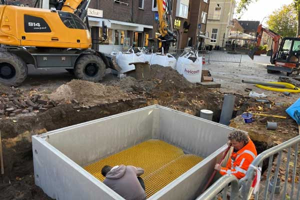De oplossing kwam in de vorm van de BRENT Urban Tree Pit, geleverd door Nursitree. Deze boombunker combineert groeiruimte met waterberging. Twee kleine vakjes met taxus zijn verwijderd en de waterleiding is iets verlegd, waardoor er precies plek ontstond voor één unit. Het systeem biedt 7 m³ bomengrond en een waterberging van 1200 liter. Overtollig regenwater infiltreert vertraagd in de bodem, waardoor het riool minder wordt belast.